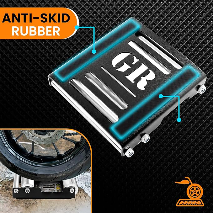 The motorcycle roller cleaning stand is a practical maintenance tool designed for easy tire cleaning and chain lubrication.