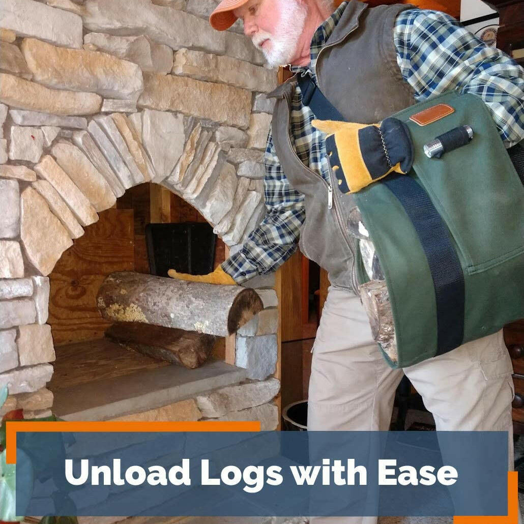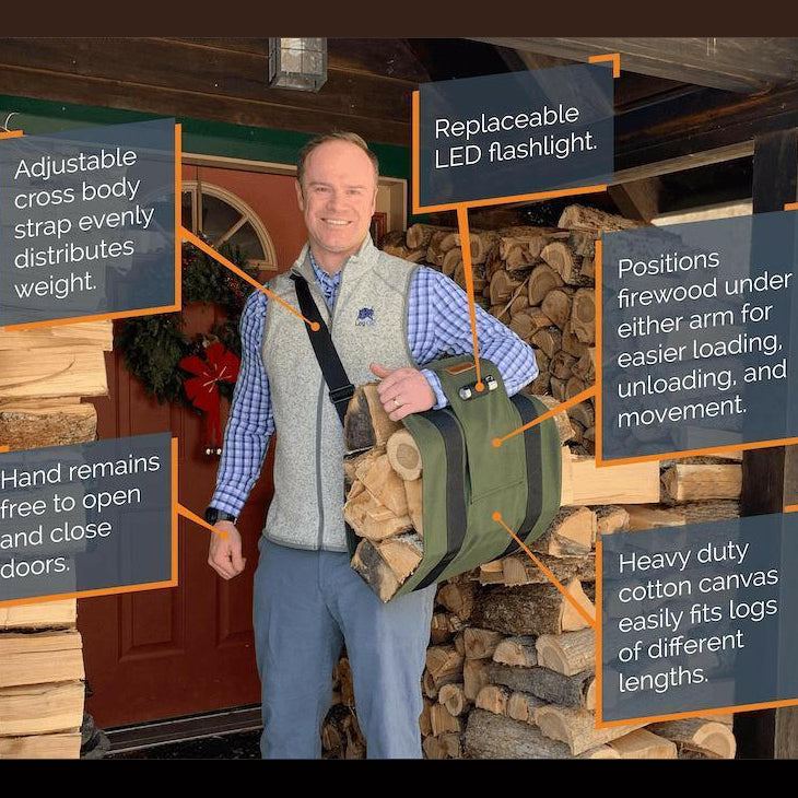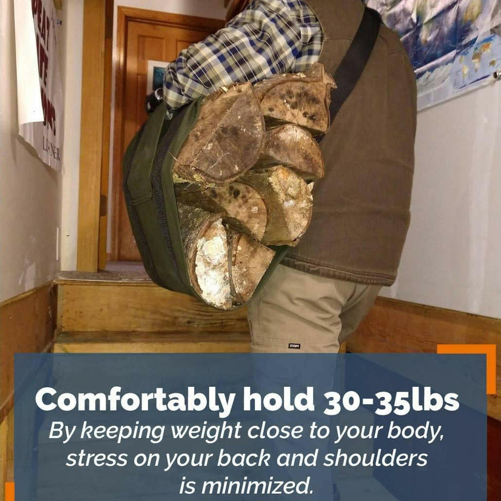An ergonomic cross-body firewood carrier that evenly distributes weight — reducing back and arm strain by up to 54% while keeping debris off your clothes and floors.