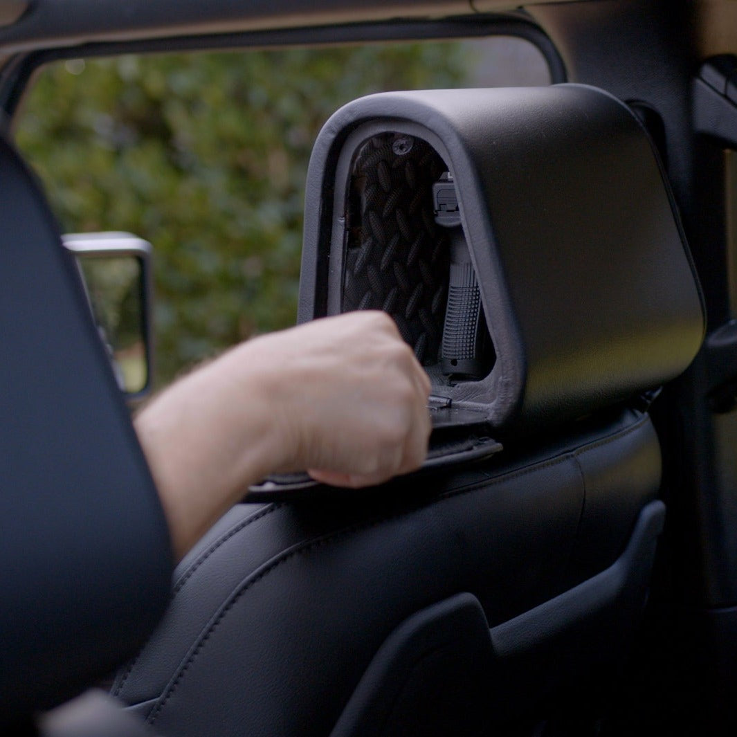 A headrest-mounted hidden safe designed to protect valuables or firearms inside your vehicle — offering maximum security whether you're in or out of the car.
