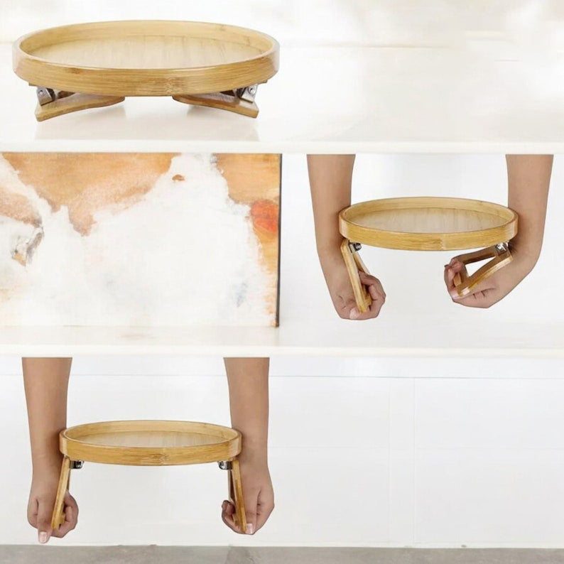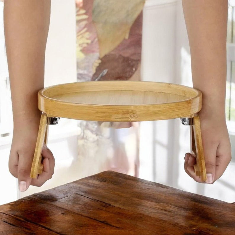 A portable wooden sofa arm tray featuring a built-in cup holder — designed to keep drinks and snacks within easy reach while relaxing on the couch.