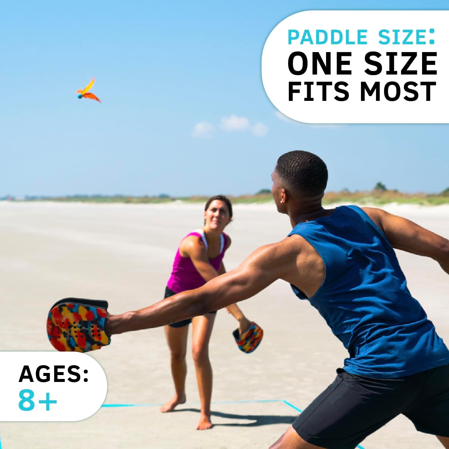 Includes 2 wearable paddles and 2 small birdie shuttlecocks. One size fits most, fits either hand for front-hand or backhand hits.
