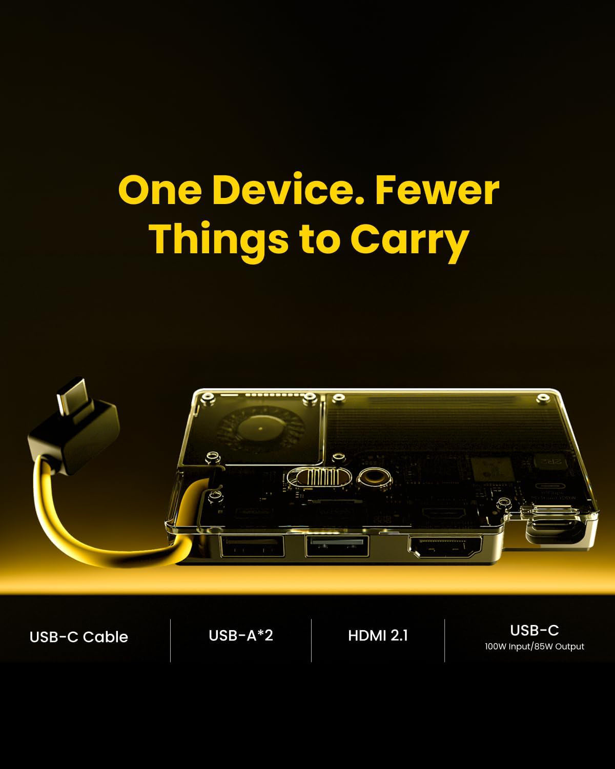Features a 4-port hub with HDMI 2.1 output, 10Gbps data transfer, and a built-in cable — expanding connectivity in a single compact device.