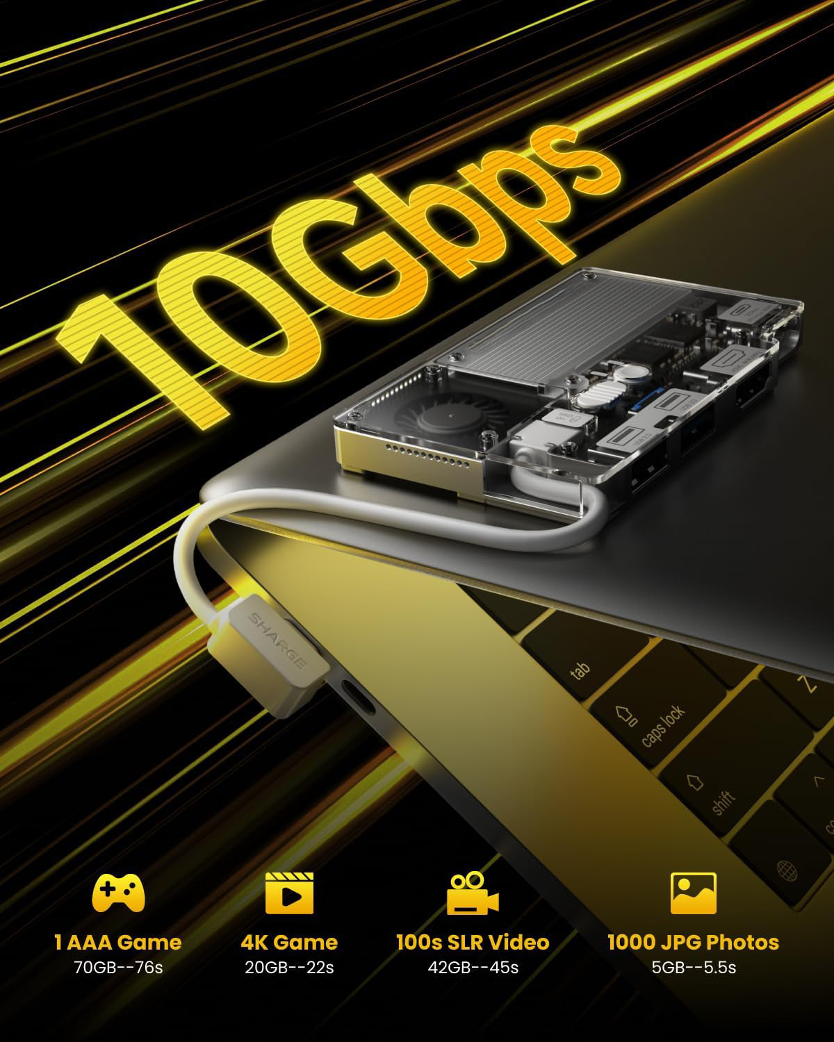 • Product Name: Portable SSD with Active Cooling Fan – 4-Port Hub with HDMI & Built-In Cable