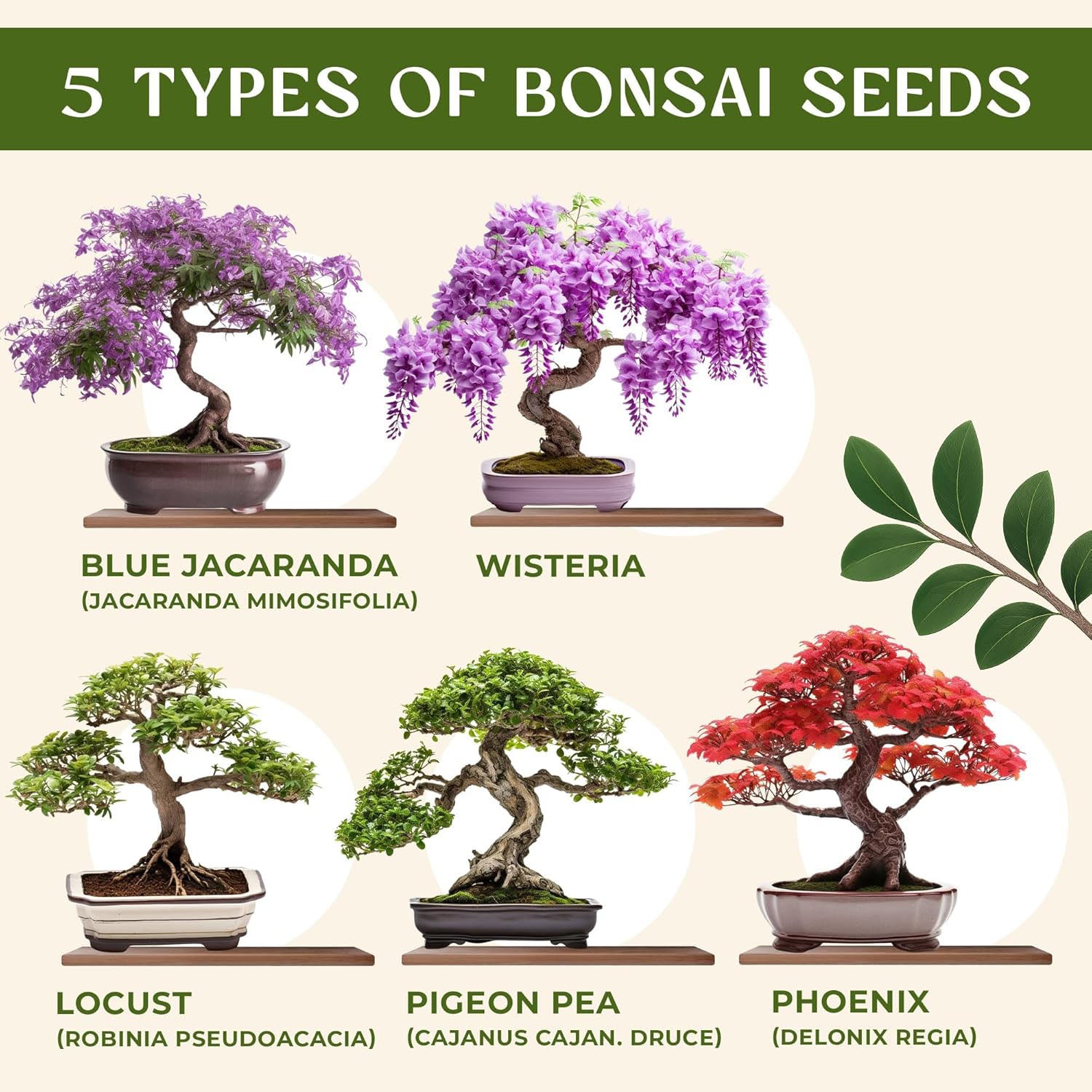 Features popular mini tree seeds such as Wisteria, Flame Tree (Delonix Regia), Blue Jacaranda (Jacaranda Mimosifolia), Pigeon Pea, and more for a diverse growing experience.