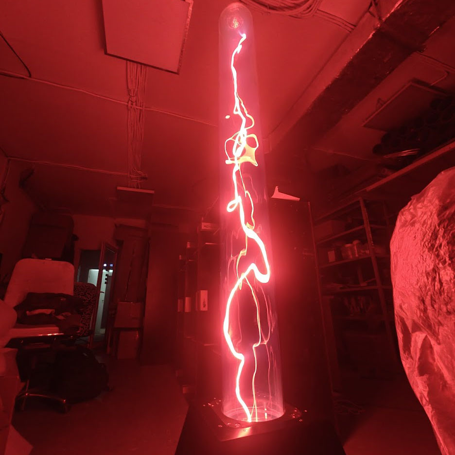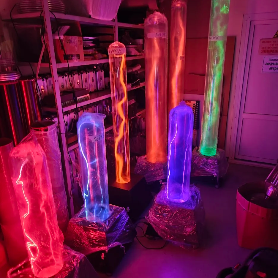 This plasma tube is a striking visual centerpiece featuring a thin neon plasma filament chaotically dancing inside a glass vessel. Far brighter than ordinary tube lights, it emits an intense, captivating glow capable of illuminating an entire room. With adjustable power and a tall, elegant form, it’s designed to impress anyone who sees it in action.